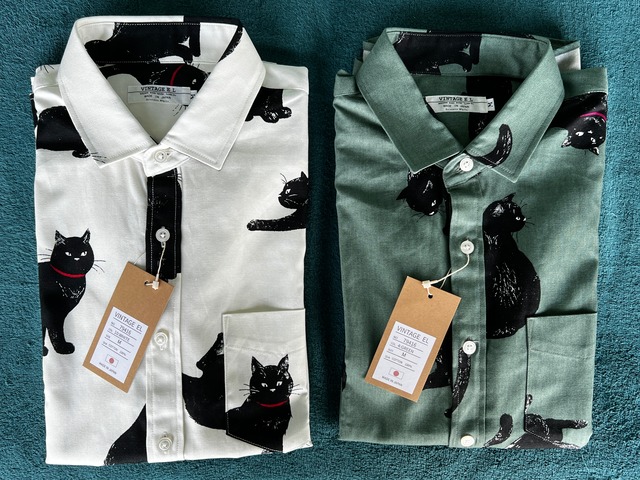 【日本製】VINTAGE EL 黒ネコ柄 半袖シャツ オックスシャツ